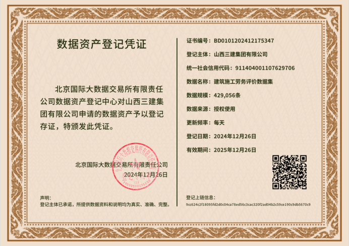 12月26日,山西建投三建集团在北京国际大数据交易所成功完成“建筑施工劳务评价数据集”数据资产登记,并成功实现数据资产入表,成为全国首例建筑施工劳务数据入表企业。