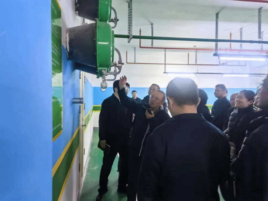 在总部地下车库负二层的人防区域,现场为参训学员介绍主要出入口与次要出入口的布置、人防门安装注意事项、滤毒室与除尘室里的设备要点等。