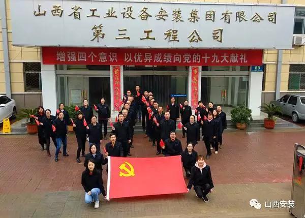 第三工程公司党总支组织机关全体职工身着工装,撑起党旗,手持国旗,为党的十九大胜利召开送上美好祝愿。