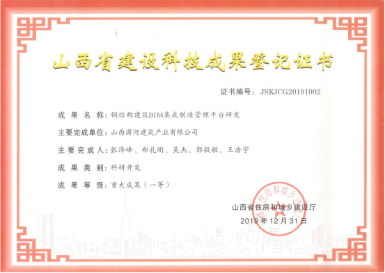 钢结构建筑BIM集成制造管理平台研发成果登记证书