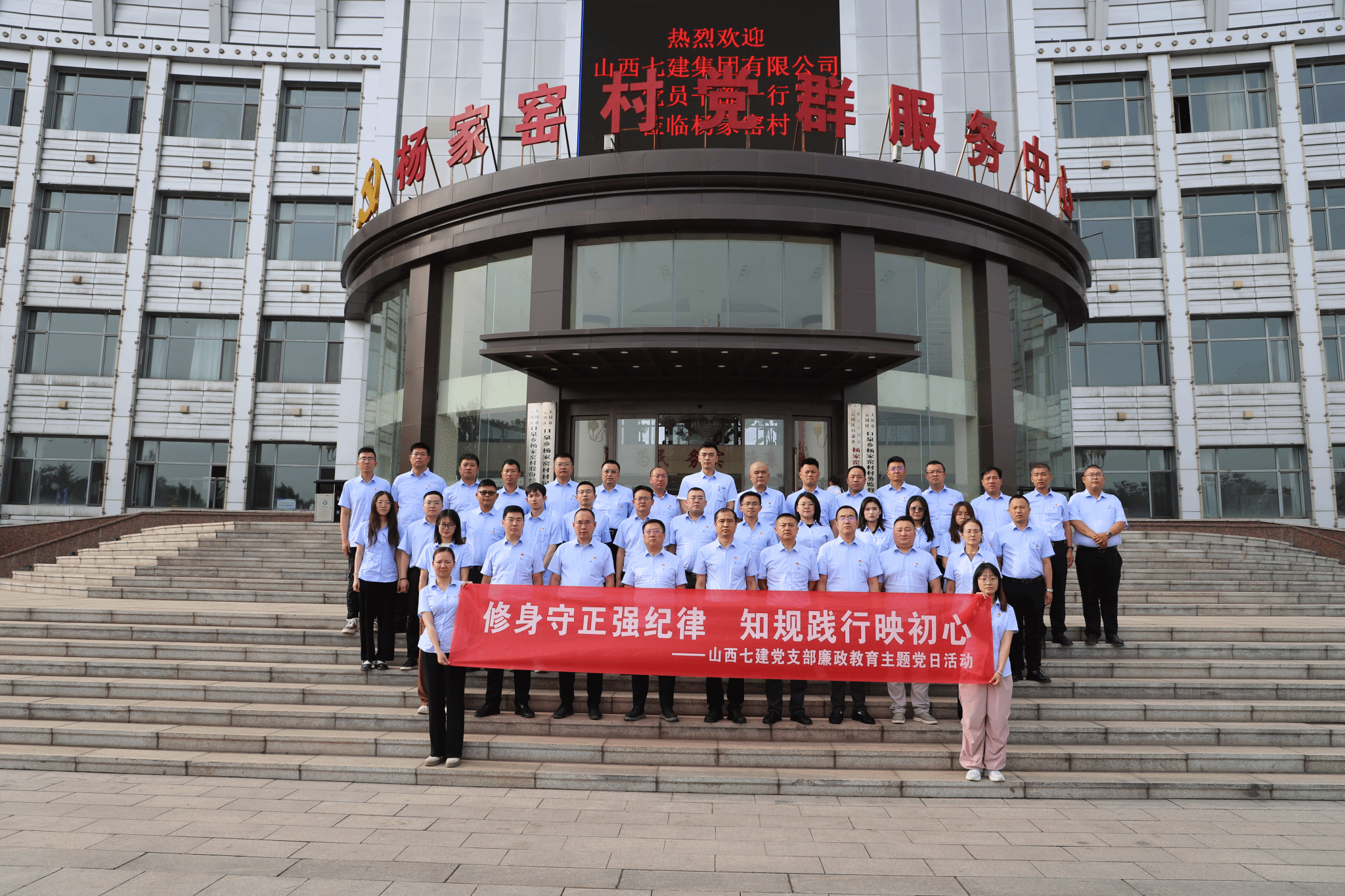 七建集团组织党员干部赴杨家窑村党建廉政教育基地开展“修身守正强纪律 知规践行映初心”主题党日活动。全体党员在教育基地宣誓厅整齐列队,面对鲜红的党旗,举起右拳,重温入党誓词。